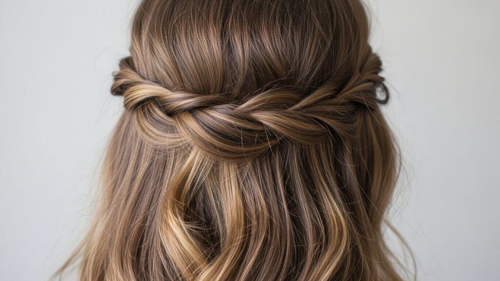 Using a section of your own hair as a headband is a trick that always looks casually romantic. Take a front section from one side, twist it gently, and pull it across your forehead to the opposite side, pinning it discreetly behind your ear. The twist should be soft, allowing smaller hairs to spiral out. It’s a detail that elevates down hair or a simple ponytail without effort.