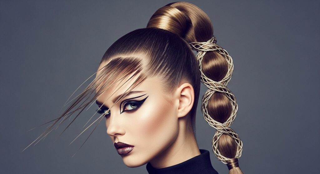 Take your basic ponytail to the next level. By adding a single infinity loop at the base, you instantly create height, texture, and a cool-girl vibe. The key to the glitchy glam hair effect is intentional imperfection.