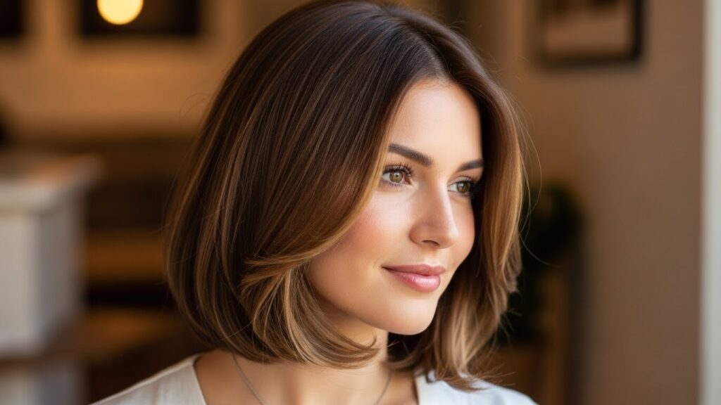A lob with a slight inward curve at the ends (a “blunt lob”) can also be very flattering, as it helps to visually round out the chin area.