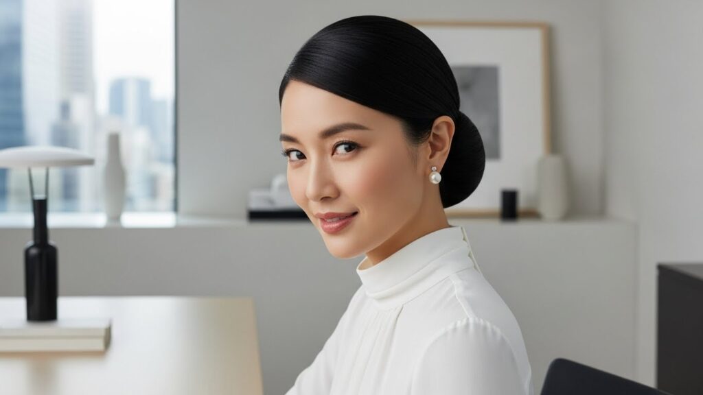 This style works for all hair lengths when paired with a hair donut or sock bun for volume. It’s a timeless choice that pairs equally well with a sharp blazer and a classic sheath dress.