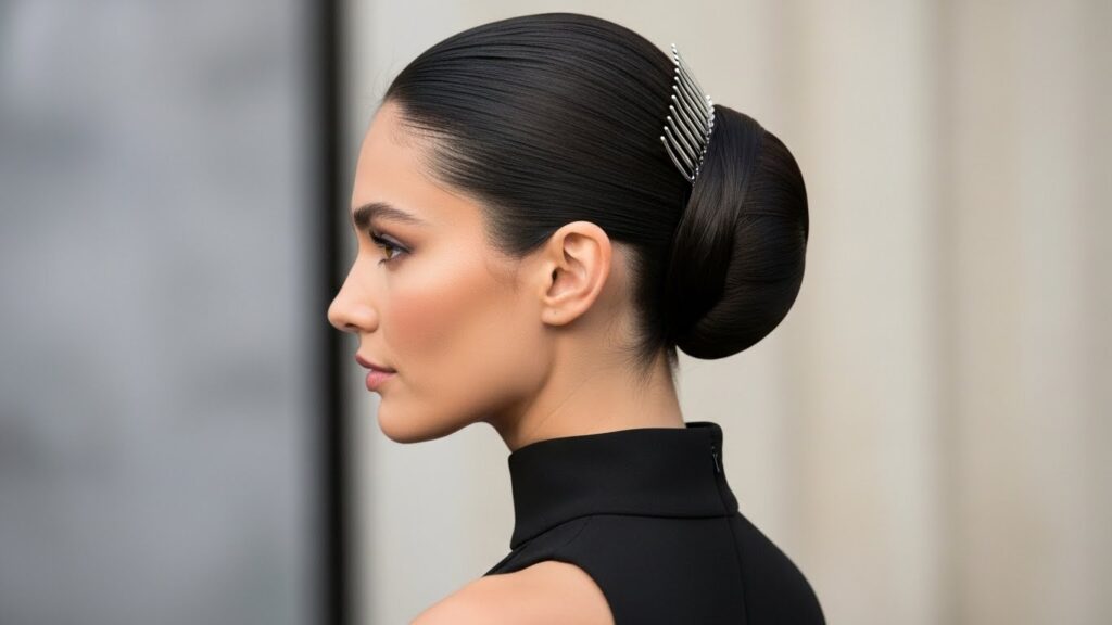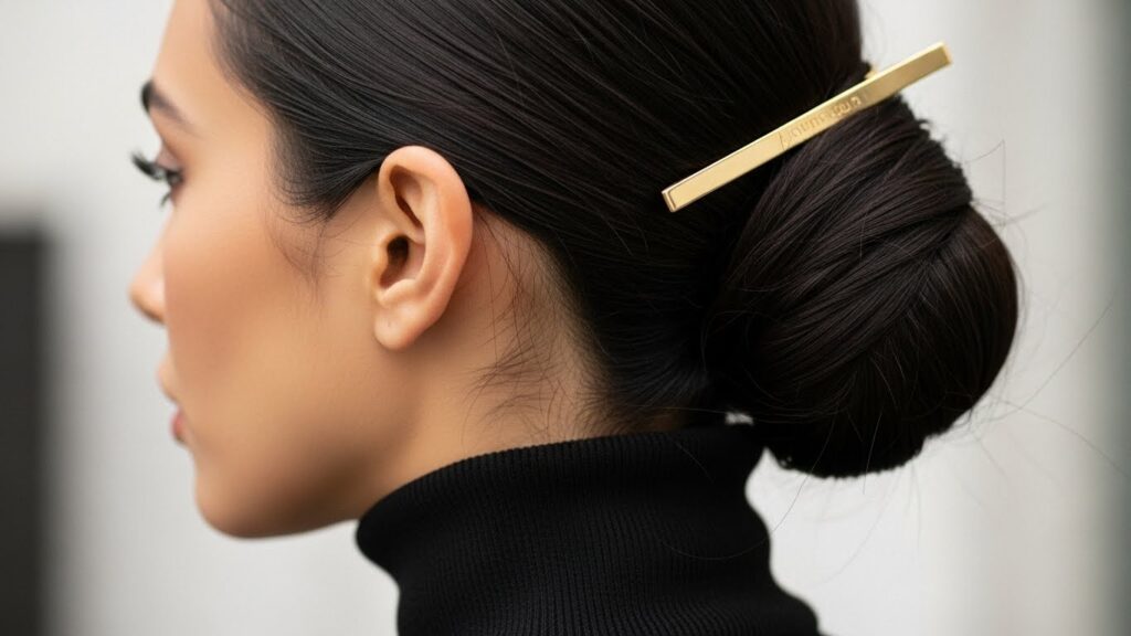 Elevate any simple bun or twist with strategic accessories. A chignon secured with a sophisticated hair clip, a few pearl-ended pins, or a minimalist leather barrette instantly raises the style quotient. The accessory becomes the focal point, turning a basic updo into a fashion statement. Choose accessories in metals like gold or silver, or in neutral colors that complement your work wardrobe.