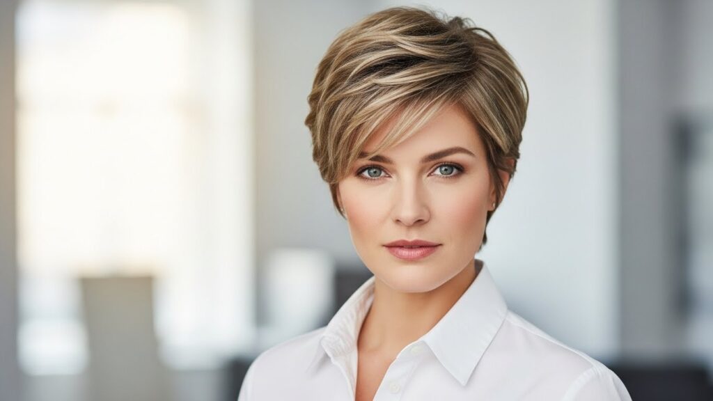 Short hair can make a powerful professional statement. A textured pixie cut is all about controlled, piece-y texture and a strong shape. With the right cut, styling is minimal: a small amount of pomade or wax rubbed between the palms and worked through the roots and ends can create separation, definition, and a modern, edgy look that is still entirely office-appropriate.