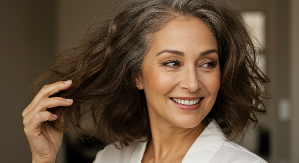 [Happy client leaving salon with beautifully styled hair, smiling at camera.]