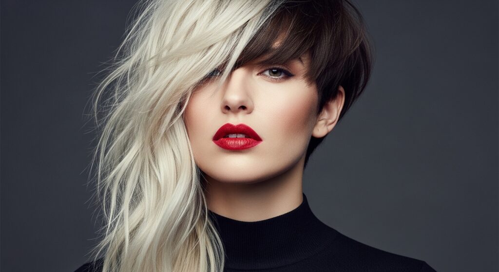 Amplify your asymmetry with color. Imagine your shorter side a bold platinum and the longer side a rich espresso. The color block follows the haircut’s lines, making the style even more dynamic.