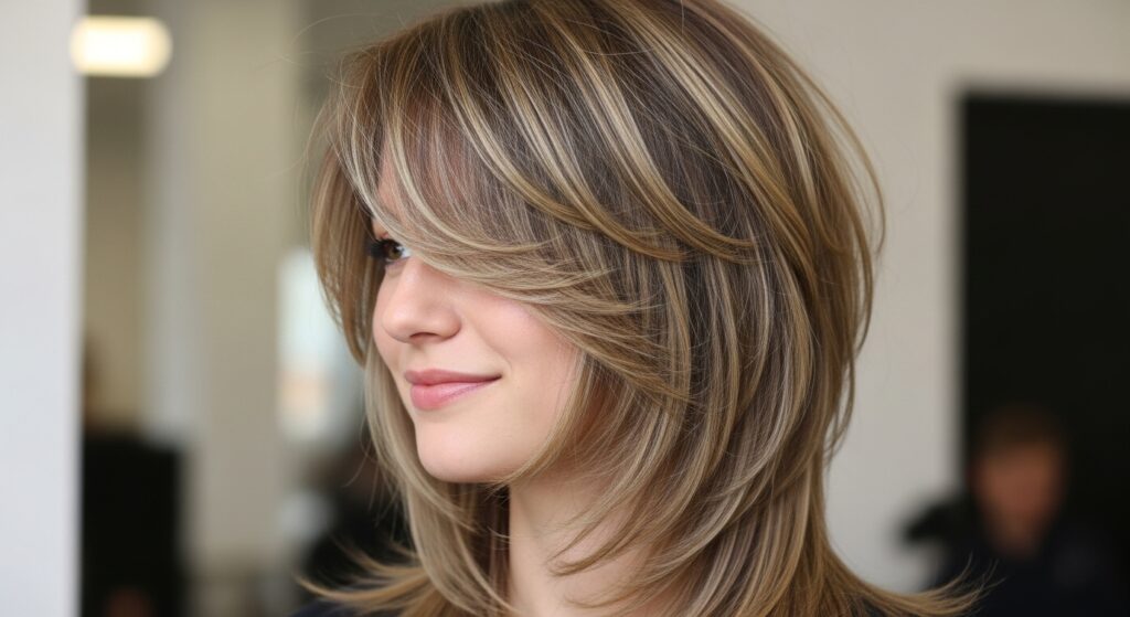 Who it’s for: Almost everyone! It’s particularly flattering for those with oval, heart, or square face shapes, as the soft layers help to balance features. It works on straight, wavy, and slightly curly hair.