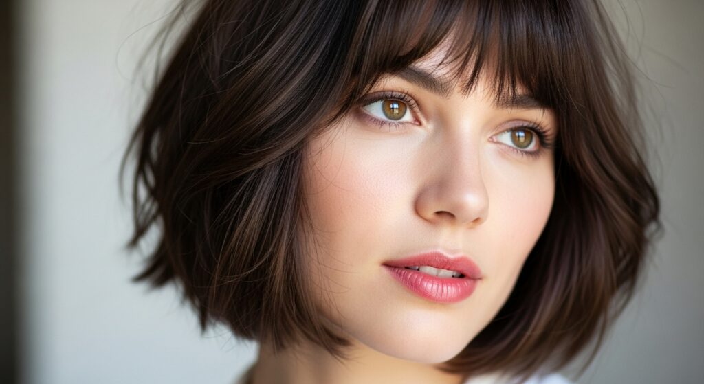 If you love the idea of a bob but want something softer than a blunt cut, the choppy bob with wispy bangs is your dream style. The bob itself is cut with internal layers to give it a light, airy feel, while wispy, see-through bangs soften the forehead and bring all the attention to your eyes. This combination is incredibly romantic and feminine, yet still feels modern and fresh.