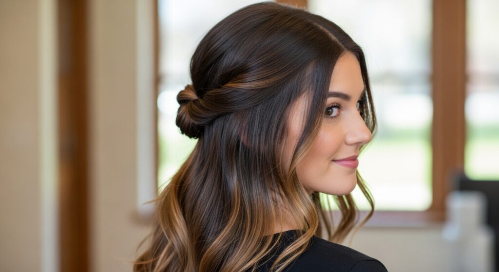 This style works best on day-old hair or with a bit of texturizing spray to add grip. Gently brush your hair back to the nape of your neck, but don’t make it too perfect. The goal is a slightly relaxed look. Secure it with a hair tie. Now for the magic: gently pull the ponytail up and over the hair tie to create a simple, elegant twist. This also helps to disguise the tie. The shorter front pieces will naturally fall out, framing your face beautifully. Smooth them down with a bit of pomade or hair wax for a polished finish.