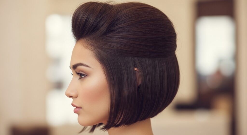 Section off the top layer of your hair, from about the middle of your head forward. Lightly backcomb or tease the roots of this section for lift. Then, gently smooth the top layer over the teased section, being careful not to press down the volume. You can secure it with bobby pins hidden underneath the top layer. This pouf works wonderfully with both sleek and wavy styles, drawing the eye upward and making the angles of your cut appear even more dramatic.