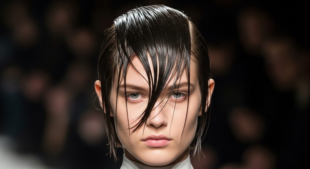 Apply a strong-hold gel or pomade to damp or dry hair. Using a fine-tooth comb, comb all your hair straight back from your hairline. Make sure every strand is slicked down smoothly. You can tuck the longer ends at the back behind your ears or let them fall naturally. The stark contrast of the slicked top and the free-flowing angled ends creates a high-fashion, editorial look that’s perfect for making a statement.