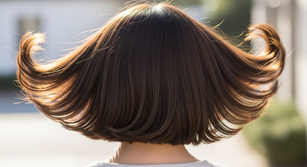 While we often curl hair under, flipping the ends out creates a fun, retro-inspired look that works beautifully with the graduated length of an angled cut.