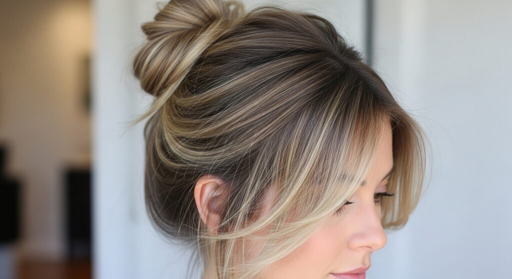 Gather your hair into a high ponytail at the crown of your head, but don’t pull all the shorter front pieces through. Let them fall out naturally to frame your face. Twist the ponytail and wrap it around the base to form a bun, securing it with bobby pins or a second hair tie. The key is to be deliberately messy—pull out a few strands from the bun and around your neck to blend with the shorter pieces. This creates a soft, effortless bun that embraces, rather than fights, the layers of your angled cut.