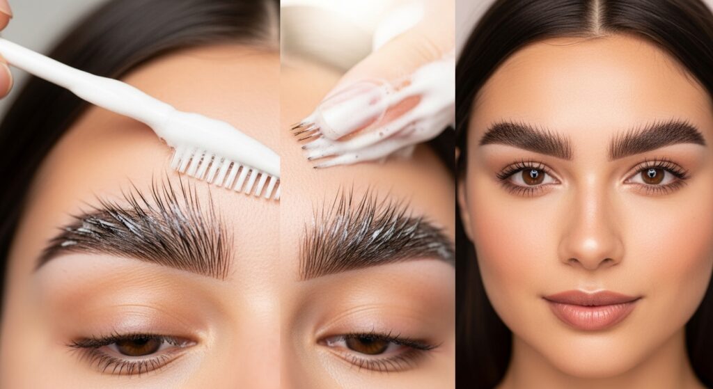 Blocky, overdrawn brows can be aging and harsh. The current trend is all about fluffy, feathery, “soap brows.” This technique uses a spoolie and a transparent soap bar (or a dedicated brow gel) to brush the hairs upwards and set them in place, creating a full, yet soft, textured look. It frames the face in a much more modern and youthful way. If you want a more permanent solution, brow lamination achieves a similar brushed-up, full effect that lasts for weeks.