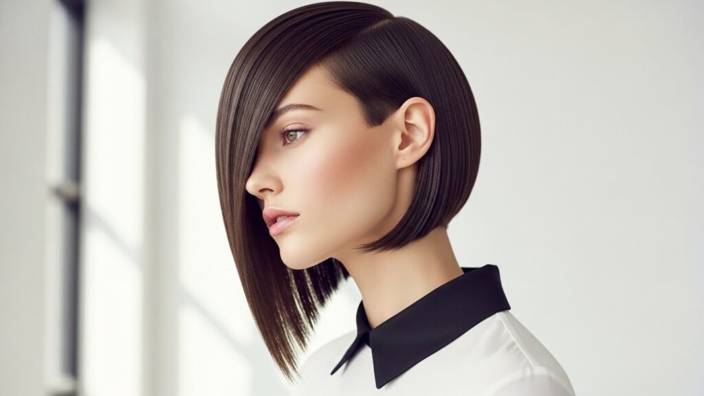 Also known as the asymmetrical lob, this cut is shorter in the back and longer in the front. The angled line is dramatic and slimming, drawing the eye diagonally. It’s particularly flattering for round and square faces, as the diagonal line counteracts the width of the jawline. The longer front pieces can also be styled to beautifully frame the face, offering a versatile, high-fashion look.