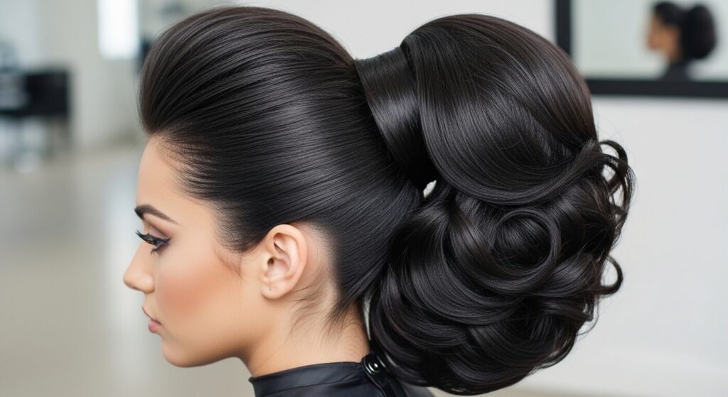 Why choose between up and down when you can have the best of both worlds? The half-up ponytail is a quintessential voluminous hair style. It keeps the hair out of your face while letting the length and body of your hair shine. To maximize volume, don’t just gather the top section. Tease the crown lightly before pulling the top half back, creating a seamless blend between the ponytail and the hair left down. This style beautifully frames the face and highlights the thickness of your hair.