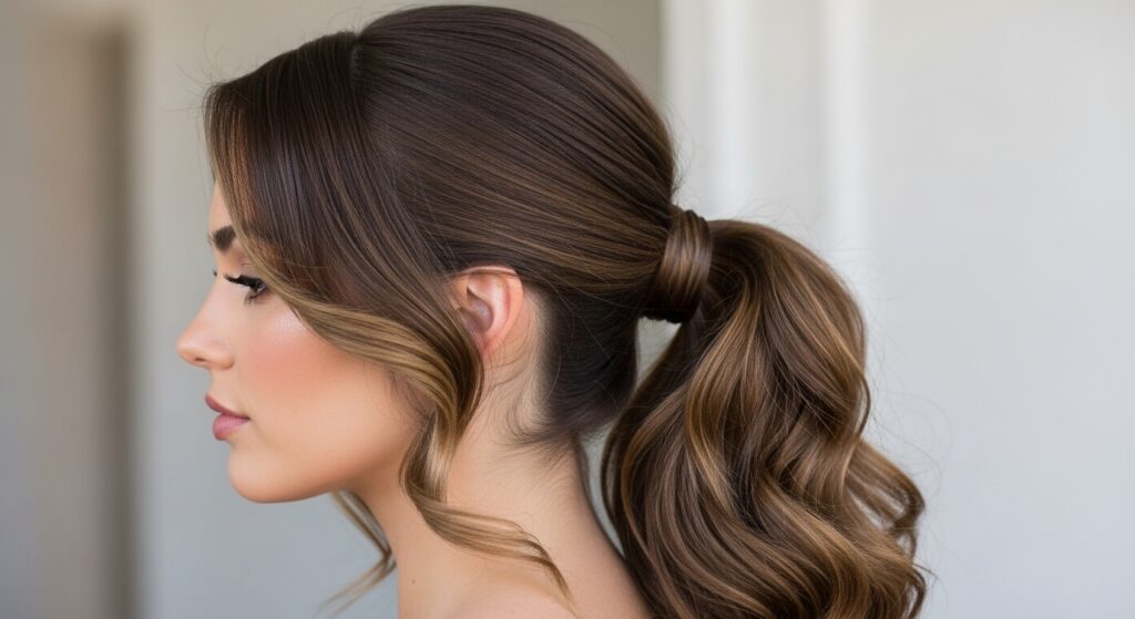 For a detail that looks intricate but is deceptively simple, try the twisted ponytail. Before gathering all your hair, take two face-framing sections from the front. Twist each section away from your face and bring them back to your desired ponytail position. Hold them in place as you gather the rest of your hair into a ponytail and secure everything together. The twisted pieces add beautiful texture and a styled detail that elevates the entire look, drawing the eye along the length of your voluminous hair.