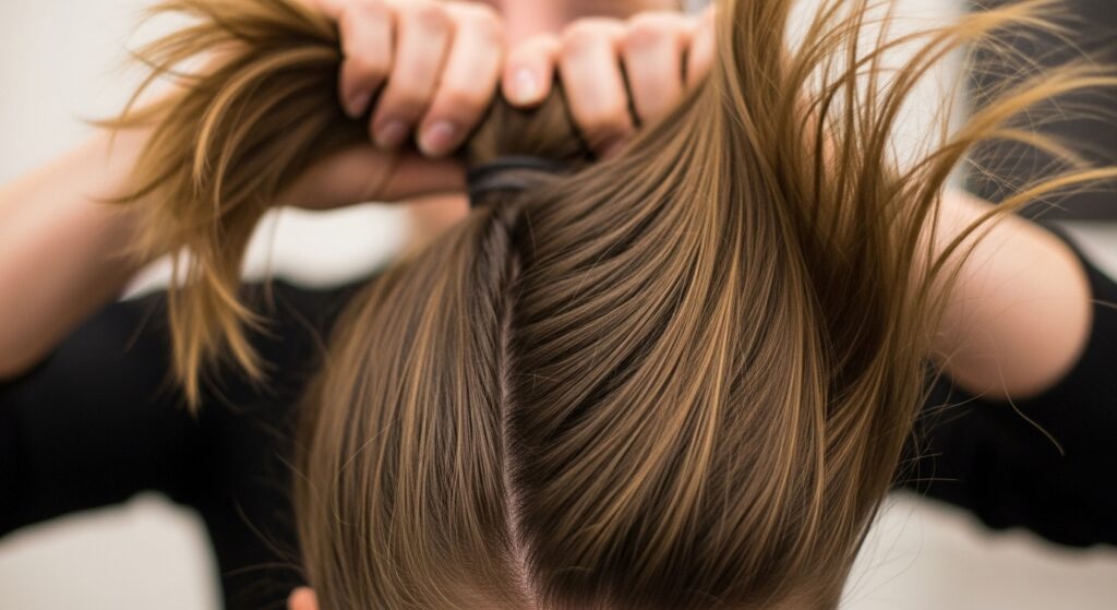 This is one of the easiest tricks in the book to add instant volume and a touch of intrigue. Start by gathering your hair into a very low ponytail, as if you’re making a half-up style at the nape of your neck. Secure it with a hair tie. Now, here’s the secret: create a small hole in the hair just above the elastic. Gently flip the ponytail up and through this hole, pulling it all the way through. Fluff the top section of hair to cover the hole and admire the beautiful, effortless volume you’ve just created at your crown.