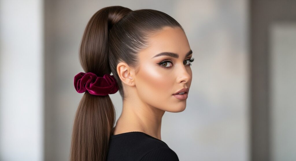 Scrunchies aren’t just a nostalgic comeback; they’re a volumizing tool! The fabric of a scrunchy provides a wider, gentler hold than a thin elastic, which naturally props up the base of your ponytail for a “puffy” effect. Create a high ponytail and secure it with a coil-free hair tie first for a strong hold. Then, wrap a large, fabric scrunchy over the top. The scrunchy will add height and width to the base of your ponytail, making the entire style look softer and more abundant.