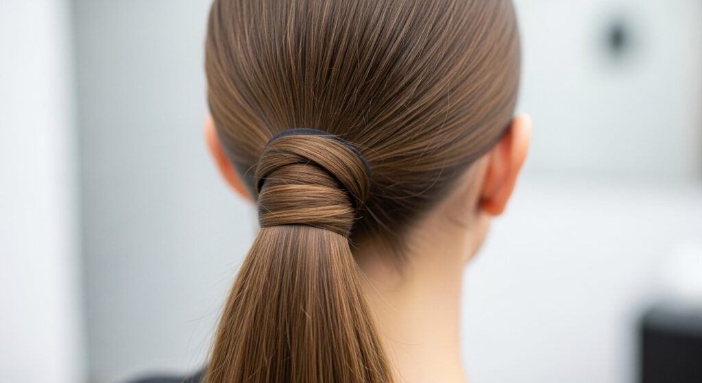 This elegant style adds a touch of sophistication and is a clever way to hide your hair tie. Create a low or mid-height ponytail and secure it. Then, take a small section of hair from the underside of the ponytail (or a separate piece if your hair is layered) and wrap it around the base, covering the elastic. Tuck the end of the wrap-underneath the ponytail and secure it with a bobby pin. This technique creates a seamless, polished look and adds a little extra thickness at the base.