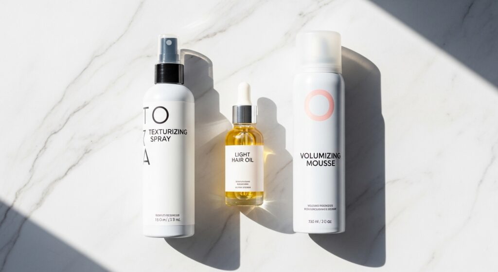 A light volumizing mousse at the roots gives lift. Finally, a drop of hair oil on just the ends tames frizz and adds shine without weighing those wisps down.
