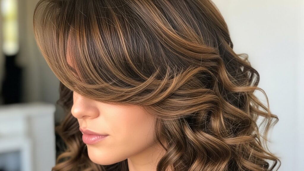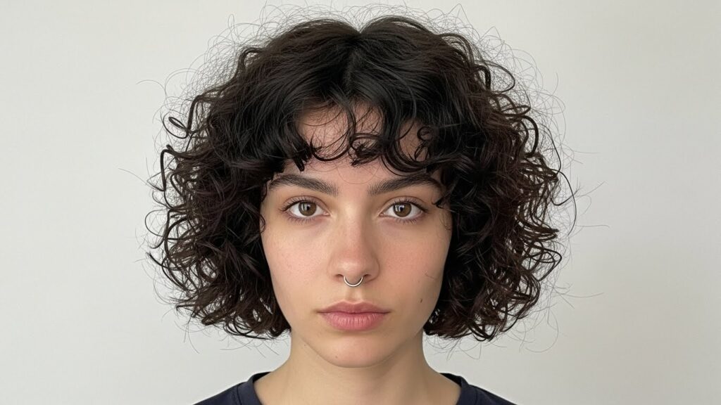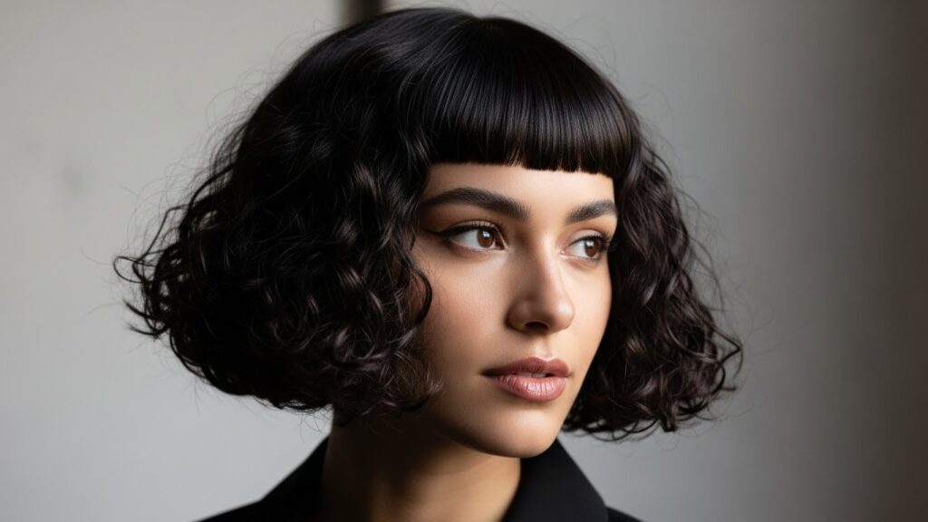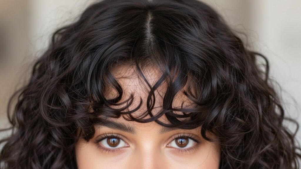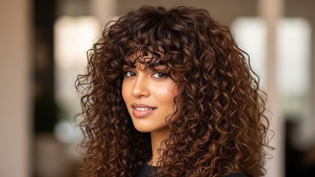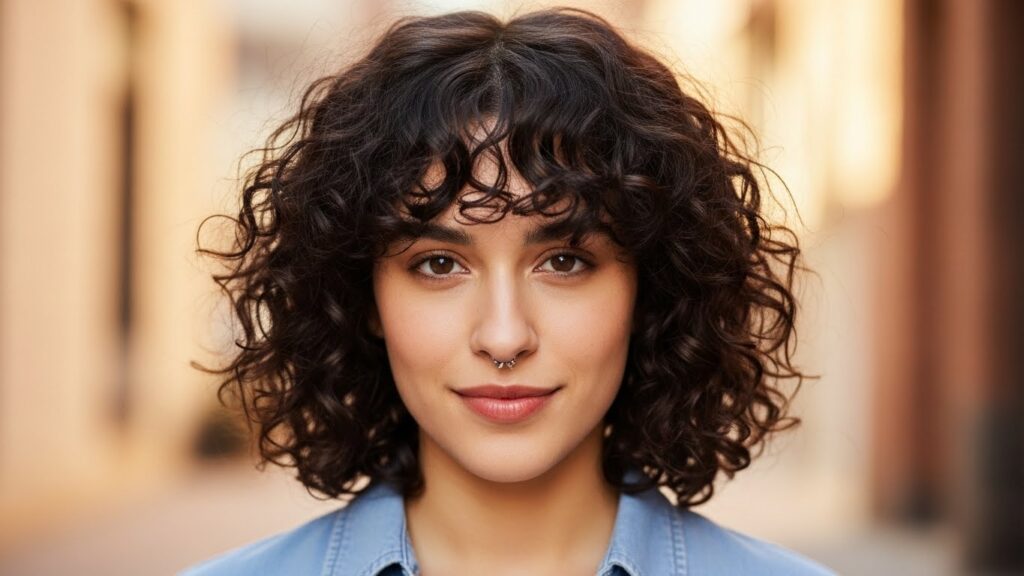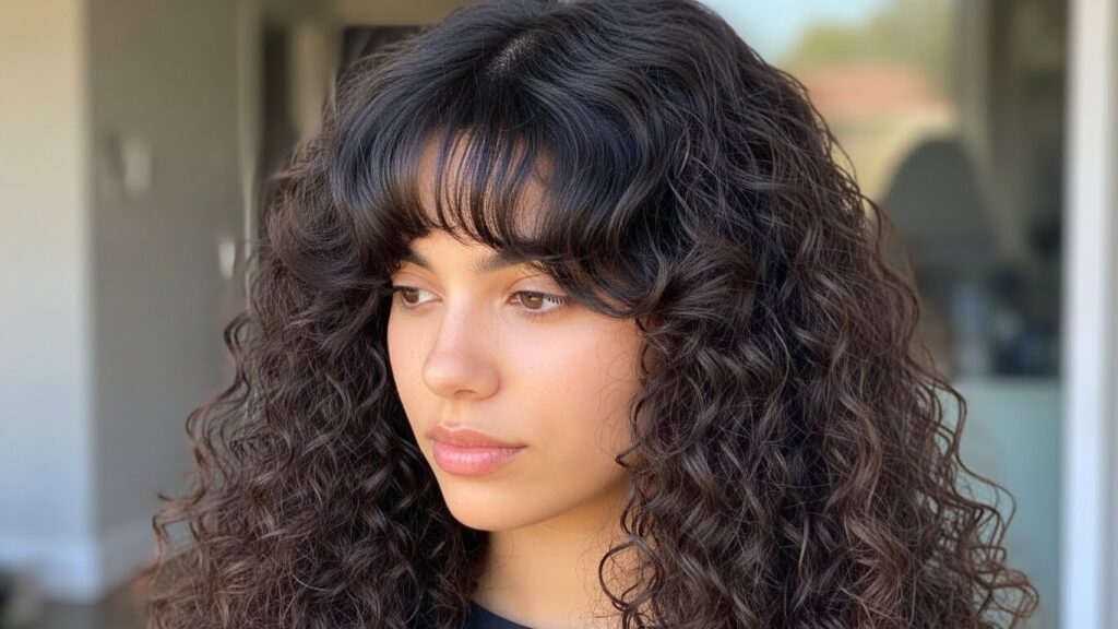 Bold, confident, and full of personality, blunt bangs make a serious statement on curly hair. Cut straight across the forehead, this style celebrates the density and volume of your curls. It’s a powerful look that draws attention to your eyes and works beautifully with short, medium, and long curly cuts.