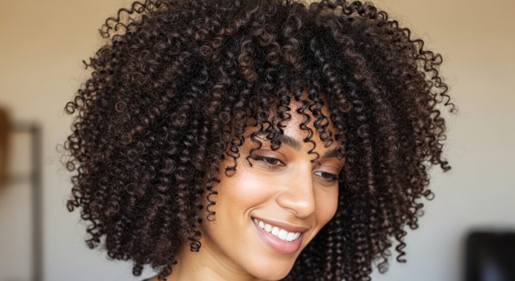 For curly hair, layers are essential to prevent a triangular shape. Voluminous curly layers enhance natural texture while reducing bulk. This cut allows curls to spring up with definition and movement.