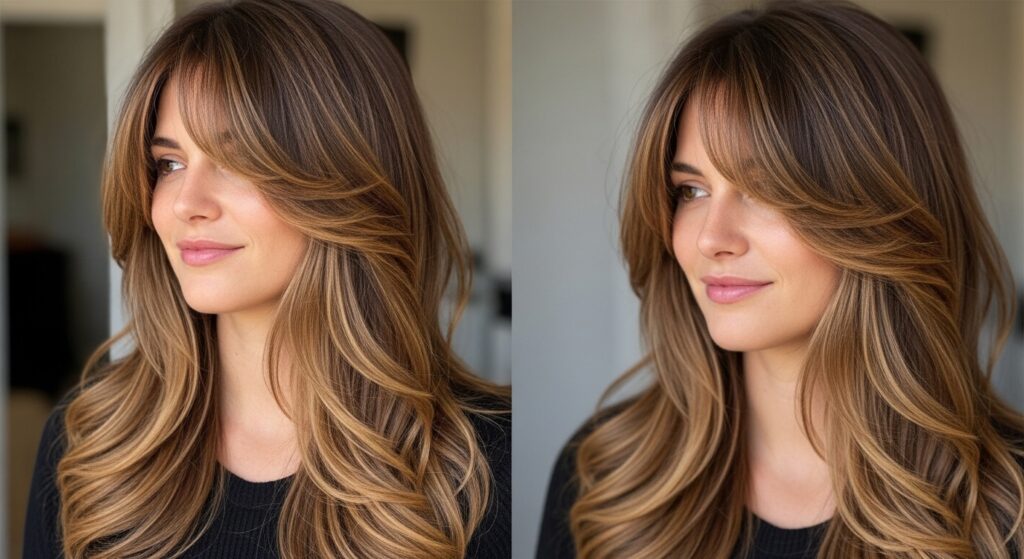For dimension that pops, combine long layers with a blonde balayage. The contrast between light and dark enhances each layer, making the movement even more noticeable.
