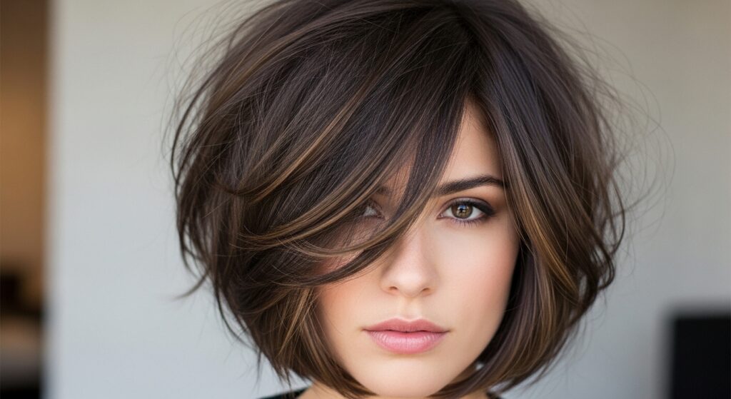 A choppy layered bob adds instant edge to short hair. Uneven layers and textured ends create a playful, lived-in style that’s easy to maintain.