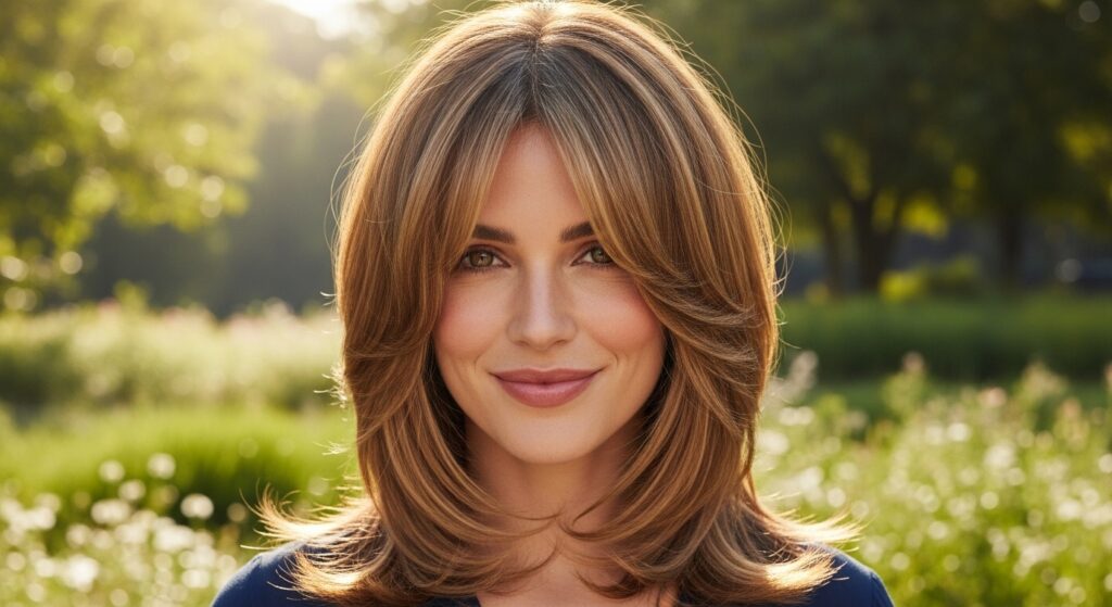 Curtain bangs paired with shoulder-length layers offer a retro yet modern aesthetic. The layers enhance movement, while the bangs frame the face beautifully.