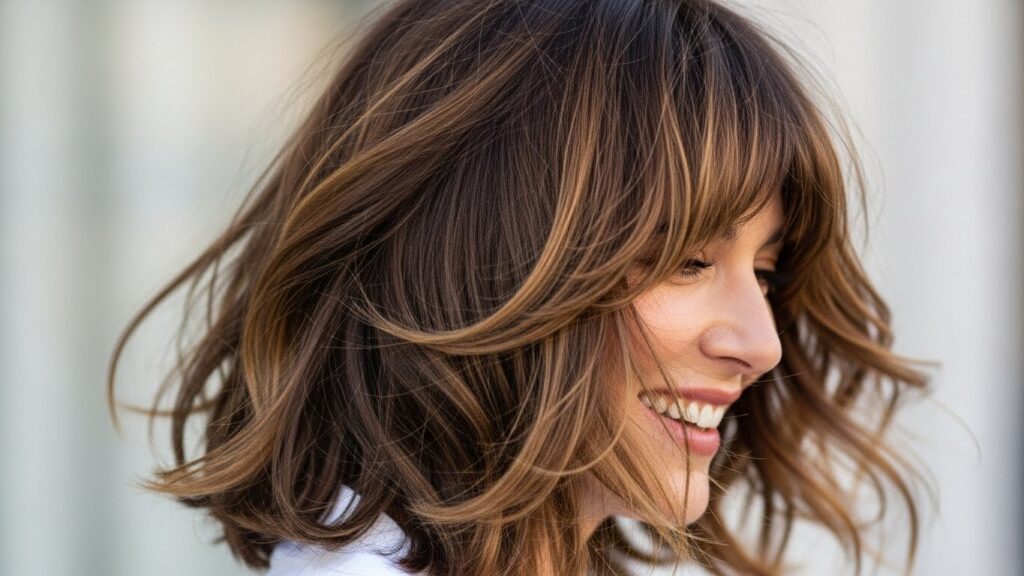 Combine the romance of waves with the flattery of side-swept bangs for a truly glamorous summer look. The bangs draw attention to the eyes, while the loose waves through the lob add softness and volume. This style has a vintage Hollywood feel that’s perfect for summer weddings or date nights. Use a large-barrel curling iron to create soft waves and a light-hold hairspray to keep the bangs in place without stiffness.
