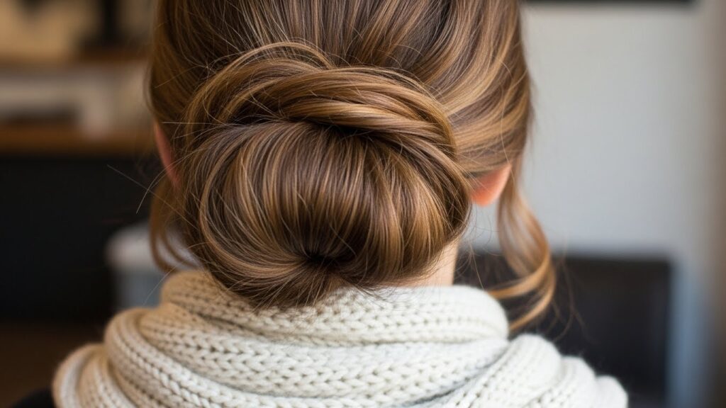 A low chignon at the nape of your neck is the epitome of winter elegance. It’s neat, sophisticated, and completely immune to wind and scarves. You can make it sleek and ballerina-tight or soft and slightly undone. This style is perfect for formal winter events, the workplace, or any time you want to look impeccably put together.