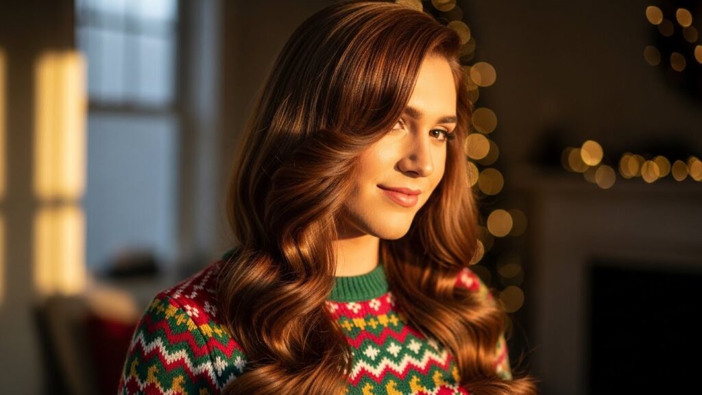 The half-updo gets a winter upgrade. Instead of a simple top knot, create two small twists on either side of your part, meeting at the back where you secure them. This pulls hair away from your face while leaving the rest down for warmth around your neck and shoulders. It’s a quick, polished style that works for both the office and a holiday dinner.