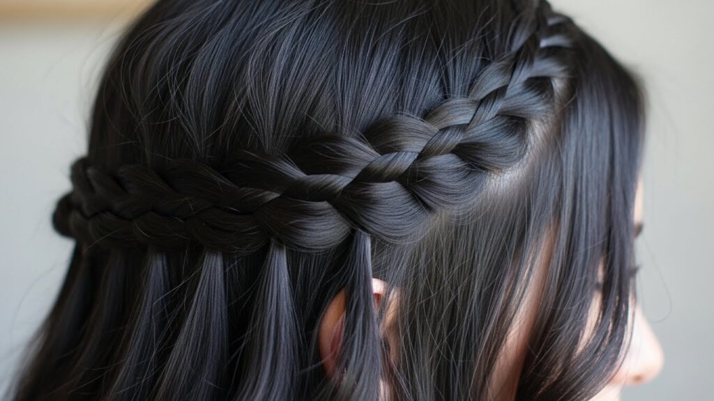 For a touch of ethereal beauty, the waterfall braid is unmatched. This technique creates a cascading effect where strands are dropped and picked up, resembling a waterfall. It’s a beautiful way to style the front sections of your hair while the rest flows freely. It looks intricate and special, making it perfect for winter weddings and holiday parties.