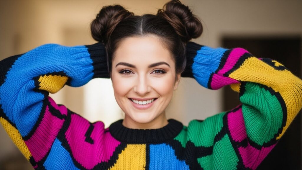 Embrace a playful, retro vibe with space buns. Split your hair into two high pigtails and twist them into buns. This fun style keeps all hair secured and away from your face and neck. It’s surprisingly practical for winter, as it creates no bulk under a hat’s crown and adds a youthful, energetic touch to your cold-weather outfits.