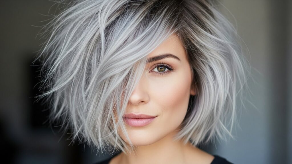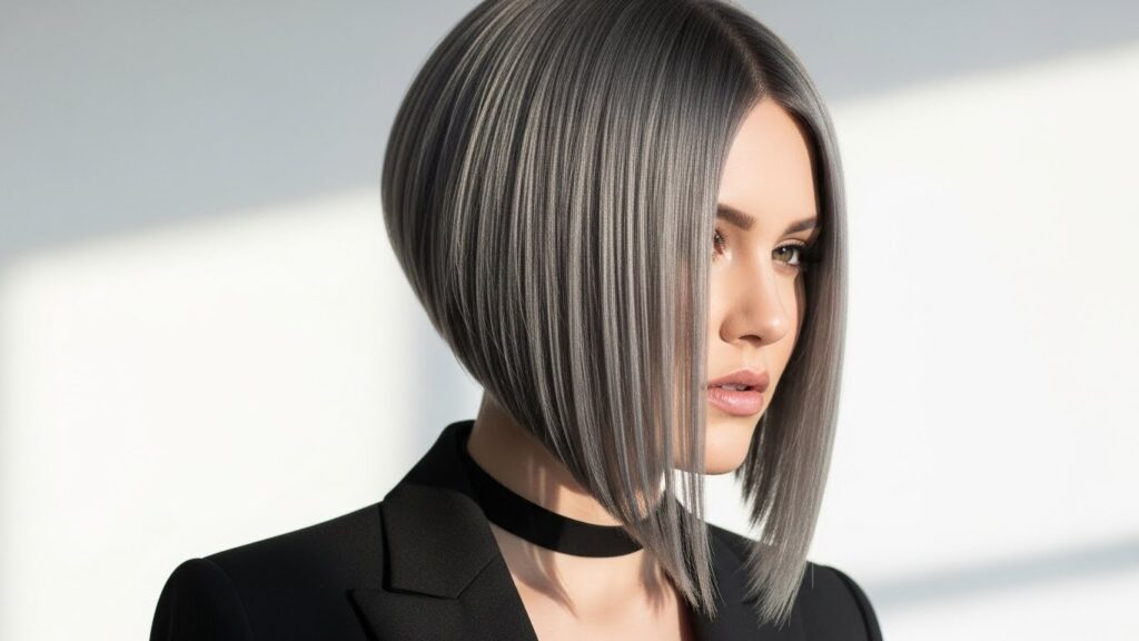 Why it works for gray hair: The clean, solid line of a bob showcases a uniform block of silver, making the color appear intense and intentional. It’s a powerful, sophisticated statement.