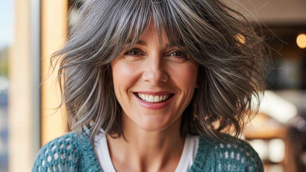 Why it works for gray hair: The feathered layers prevent bulk and add a lightness that makes gray hair appear to float around your face. It softens features and adds a touch of whimsy.