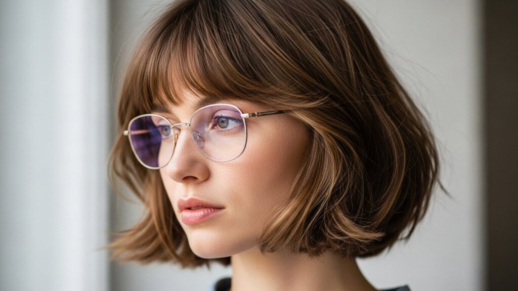 A bob is endlessly versatile, and when you add texture and wispy bangs, you get a hairstyle that’s soft, modern, and perfectly frames the face. The wispy bangs fall gently over the forehead, creating a seamless transition into the arms of your glasses.