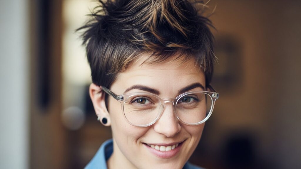 Why it works with glasses: The pixie’s clean lines and exposed neckline create a balanced look, ensuring your glasses don’t feel overwhelming. It’s a low-maintenance style that highlights your facial features beautifully.