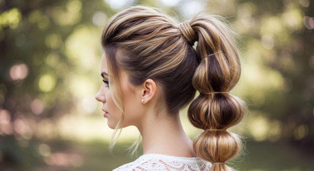 A playful take on the classic ponytail, the bubble ponytail features sections tied with small elastics to create a fun, voluminous effect. It’s a great way to add interest to an otherwise simple style.
