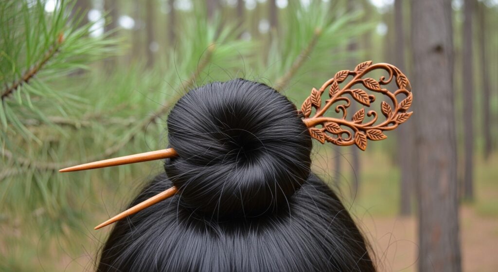 Hair Stick or Chopstick Bun: For a truly elegant and secure updo, twist your hair into a loose bun at the back of your head. Instead of pins, weave a hair stick, a polished twig, or even a chopstick through the center to hold it all in place.