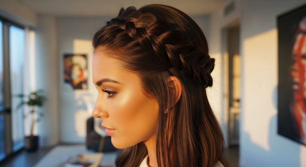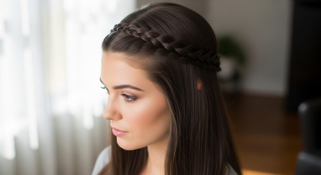 This is the easiest entry point. Simply create a single braid with a section of hair from above one ear. Lay it across your forehead like a headband and pin it behind the opposite ear. Let the tail blend with your down hair.