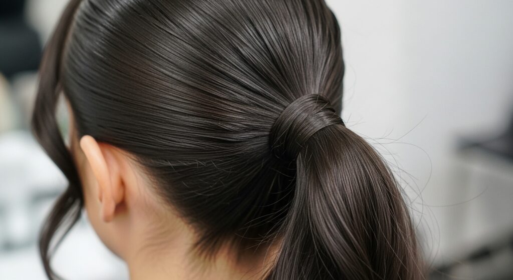 Choppy layers are a nightmare for a sleek ponytail, but they are a dream for a cool, textured one. Apply a strong-hold gel to a boar bristle brush and brush your hair back, but don’t worry about smoothing down every single baby hair. The goal is to have a polished base with those shorter layers framing your face. Secure the ponytail, and gently pull out a few face-framing pieces for a soft effect.