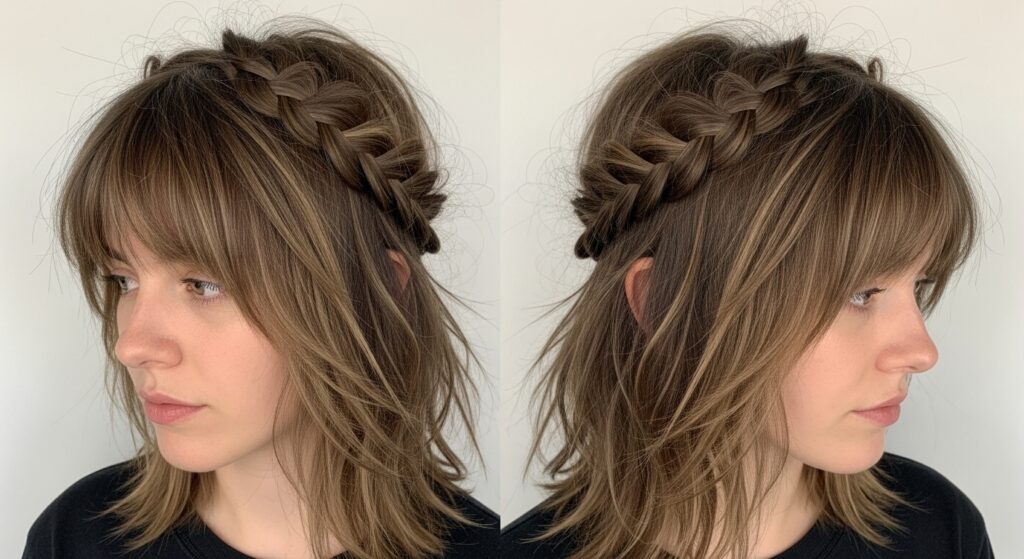 Create a deep side part. On the heavier side, take a section of hair from the front and create a loose Dutch braid (braiding under instead of over) along your hairline. Continue braiding until you reach the nape of your neck on the other side, then secure it. Tuck the end of the braid under and pin it. Leave all your choppy layers free around the rest of your head for a romantic, bohemian feel.