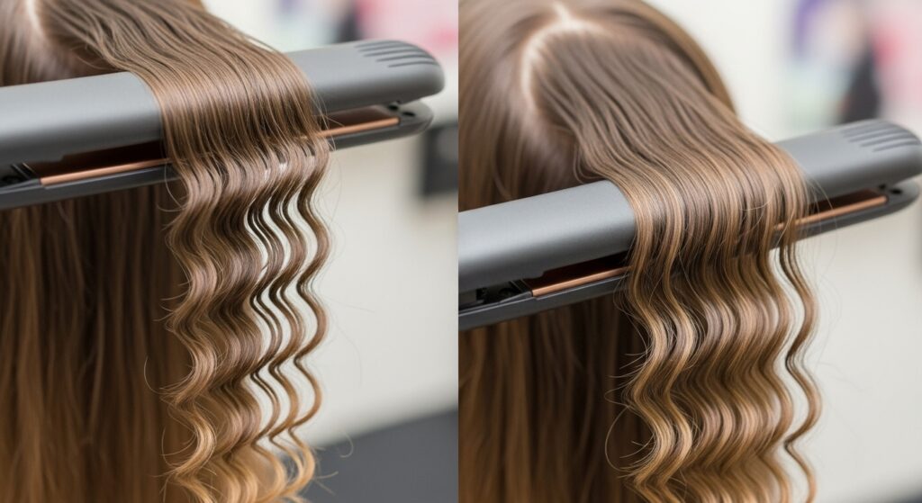This technique creates a cool, grungy wave. Take a one-inch section of hair and clamp the flat iron near the roots. Twist the iron 180 degrees away from your face and slowly pull it down the hair shaft, while simultaneously bending your wrist back towards your face in a slow, smooth motion. The result is a relaxed, zig-zag wave that looks amazing in choppy hair.