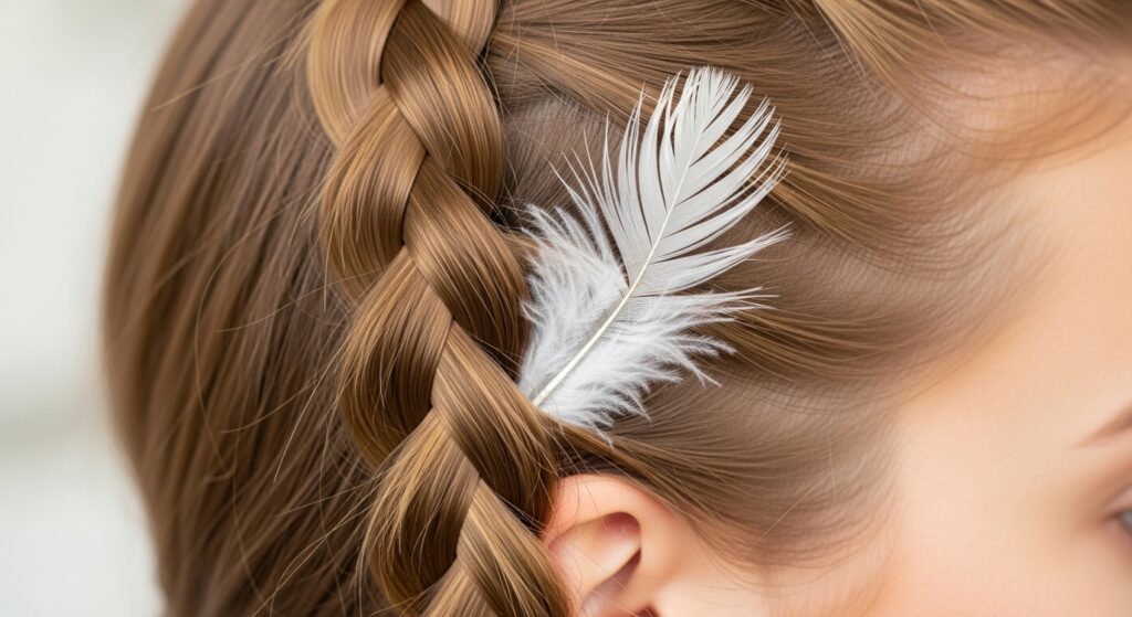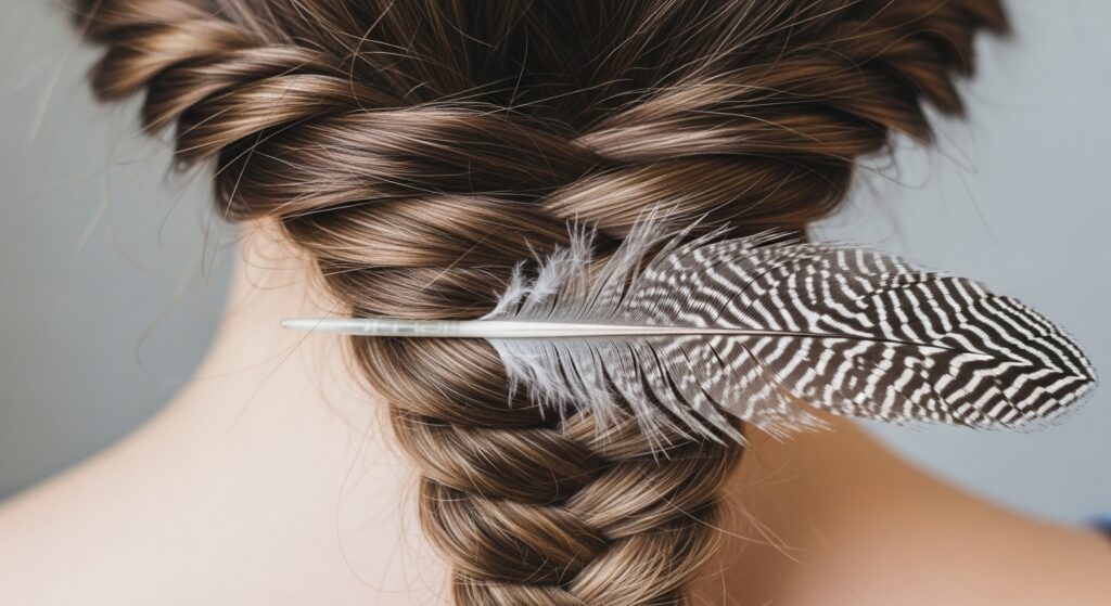 The rope braid (or twist) is simple yet elegant. Create two rope braids and wrap them around each other for added texture. Before you start twisting, lay a long, slender feather along one section of hair. As you twist, the feather will spiral beautifully within the braid, revealing itself in a stunning helical pattern.