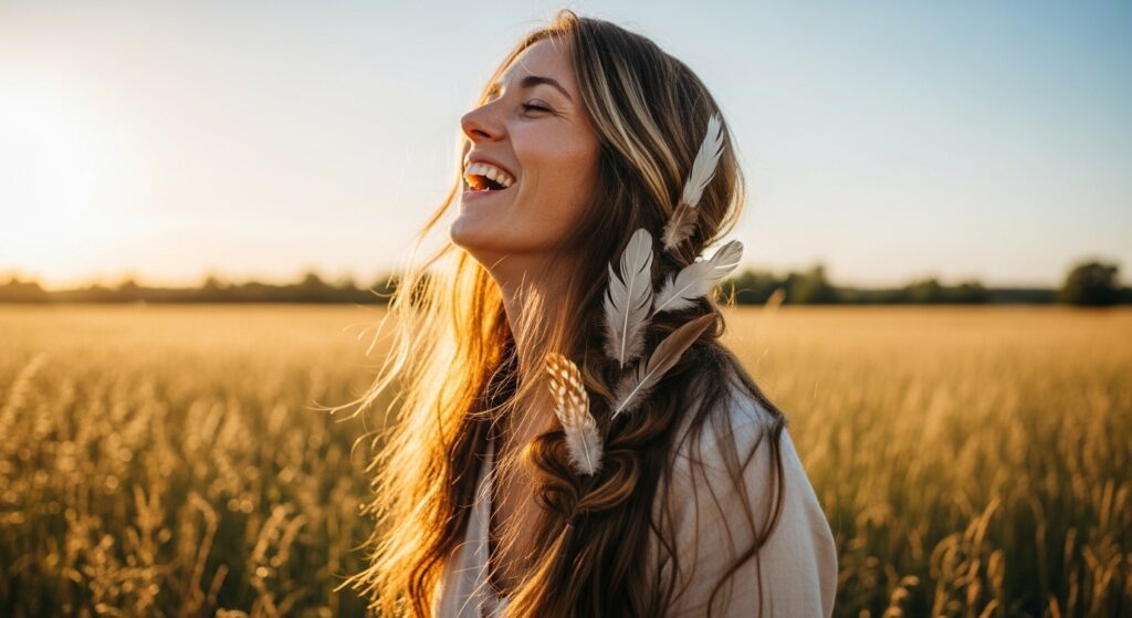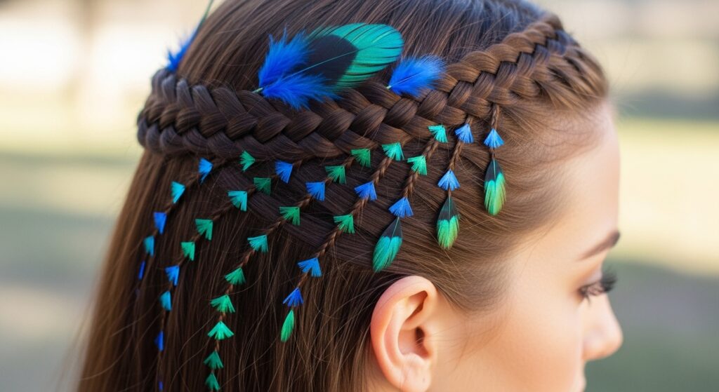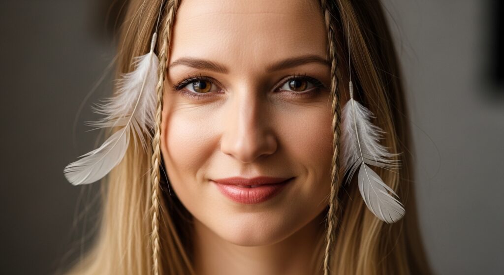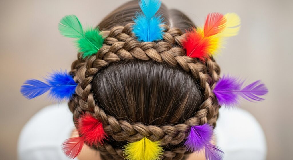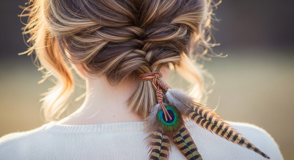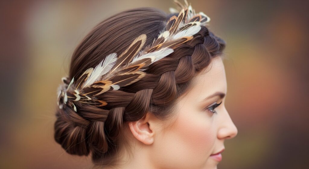This playful style involves creating two braids—either regular or Dutch—and then wrapping them across the top of your head like a crown. As you wrap and pin each braid, tuck the tips of feathers into the pins so they sprout upwards or outwards. The result is a whimsical, adorned crown that feels both rustic and festive.