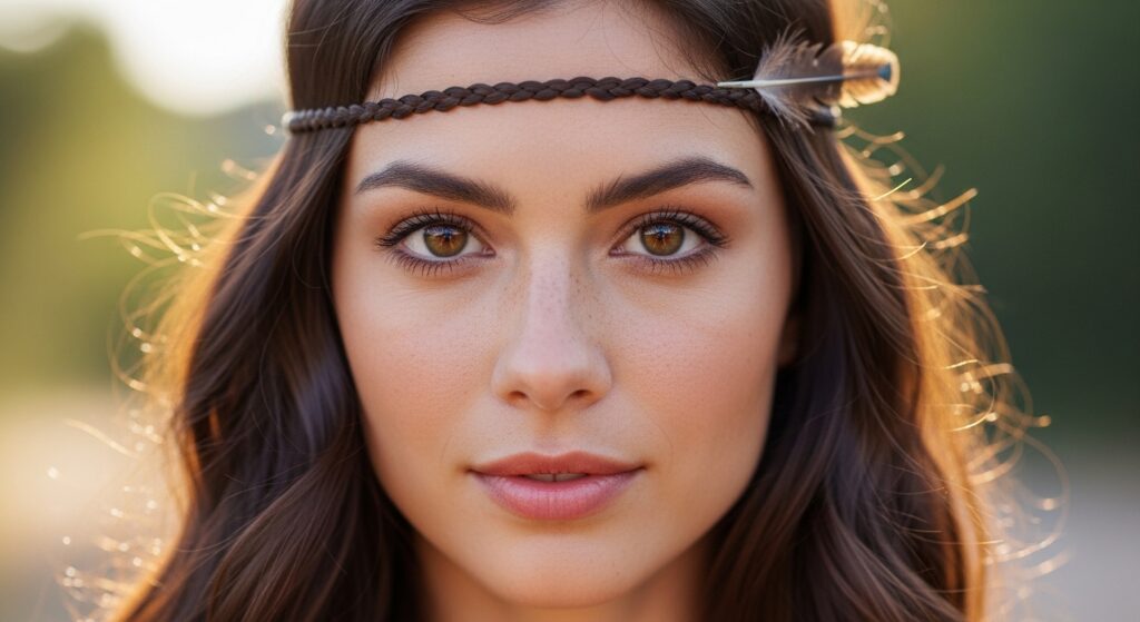 Instead of a physical headband, create one out of your hair. Braid a small section of hair from one temple to the other, incorporating a thin feather strand into the braid itself. Pin it behind the opposite ear. This creates a delicate, adorned headband that beautifully frames the face and adds a touch of boho charm to loose, wavy hair.