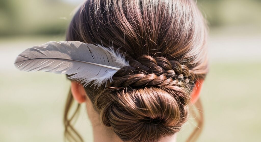 Create a small, messy bun at the back of your crown with the top half of your hair. Before twisting the bun, braid a small section that will wrap around its base. Weave a feather into this wrapping braid. Secure everything in place, allowing the feather to curl around the bun for a sophisticated, nature-inspired updo.