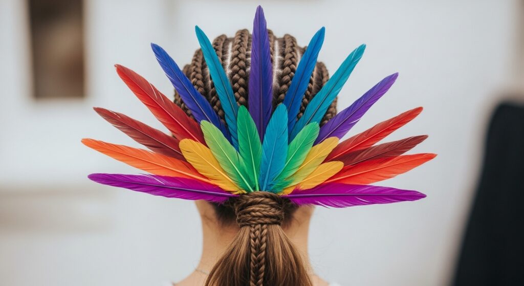 For a boho look with an edge, try double Dutch braids (aka boxer braids). This style offers a strong foundation for more dramatic feather play. Use vibrant, colorful feathers—like deep turquoise, fiery orange, or metallic gold—and weave multiple strands into each braid. The contrast between the sleek, tight braids and the wild, soft feathers is absolutely striking.