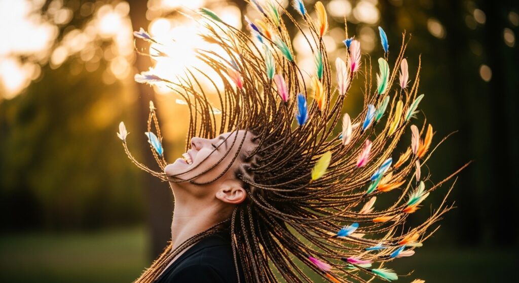 Channel ultimate festival vibes with a set of micro braids or box braids. At the end of select braids—perhaps just around your face or scattered throughout—attach tiny feather charms or clips. This creates a look of movement and texture, with feathers dancing with every step you take. It’s a commitment but a breathtaking one.