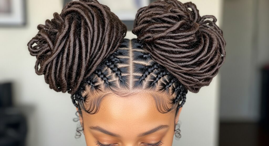 Youthful, fun, and utterly defined. Create two high ponytails (or more!) on either side of your head after finger coiling. Then, wrap the coiled hair around the base to form buns. Because your hair is already in defined spirals, these buns will be full of texture and pattern, unlike smooth ballerina buns. It’s a playful protective style that keeps your coils intact.